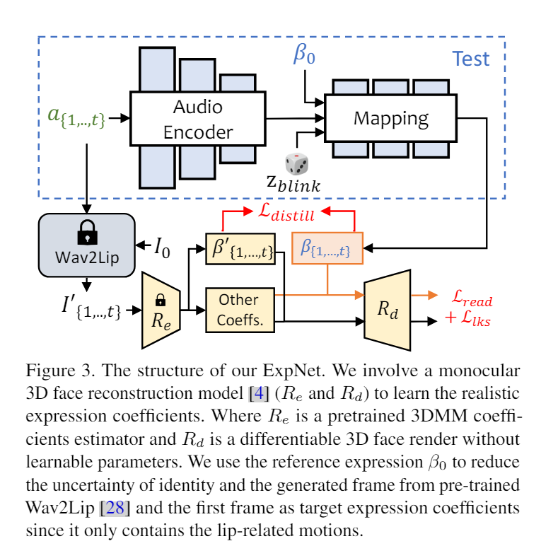 - 对于表情系数的提取,提出一个音频到表情系数网络ExpNet,希望从Wavlip的唇形运动系数和重建渲染的 3D 面部上的感知损失(唇形同步损失、面部关键点损失)中提取系数 。