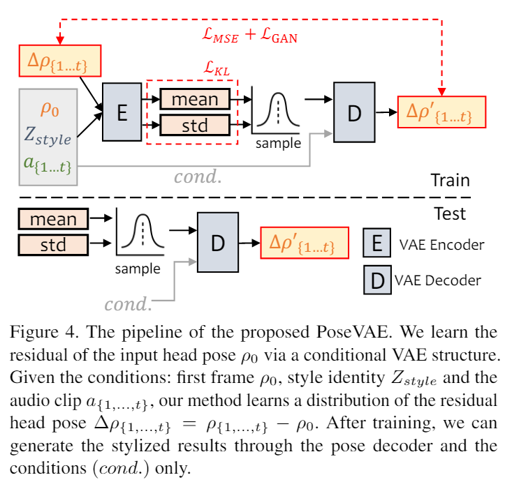 如图4,一个基于VAE的模型PoseVAE用于学习逼真的有个人风格的头部运动 ρ ∈ R^6,PoseVAE是一个编码器解码器结构。在训练时,在固定的n帧进行训练,编码器与解码器输入包括连续的t帧头部姿势,embed为高斯分布,解码器网络根据采样到的分布学习生成t帧姿态。