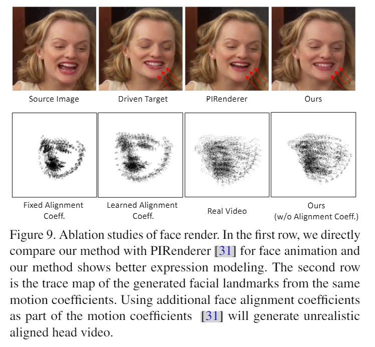 - 第二行作者发现如果使用PIRender使用的面部对齐系数,会生成不真实的头部对齐视频,而本文生成的视频的结果更像真实视频中的轨迹图。