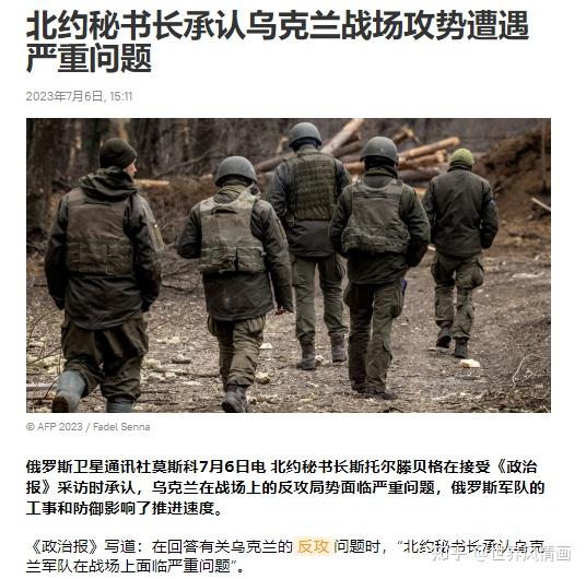 此外,俄罗斯卫星通讯社华语网站还言,“北约秘书长斯托尔滕贝格在接受《政治报》采访时承认,乌克兰在战场上的反攻局势面临严重问题,俄罗斯军队的工事和防御影响了推进速度。”