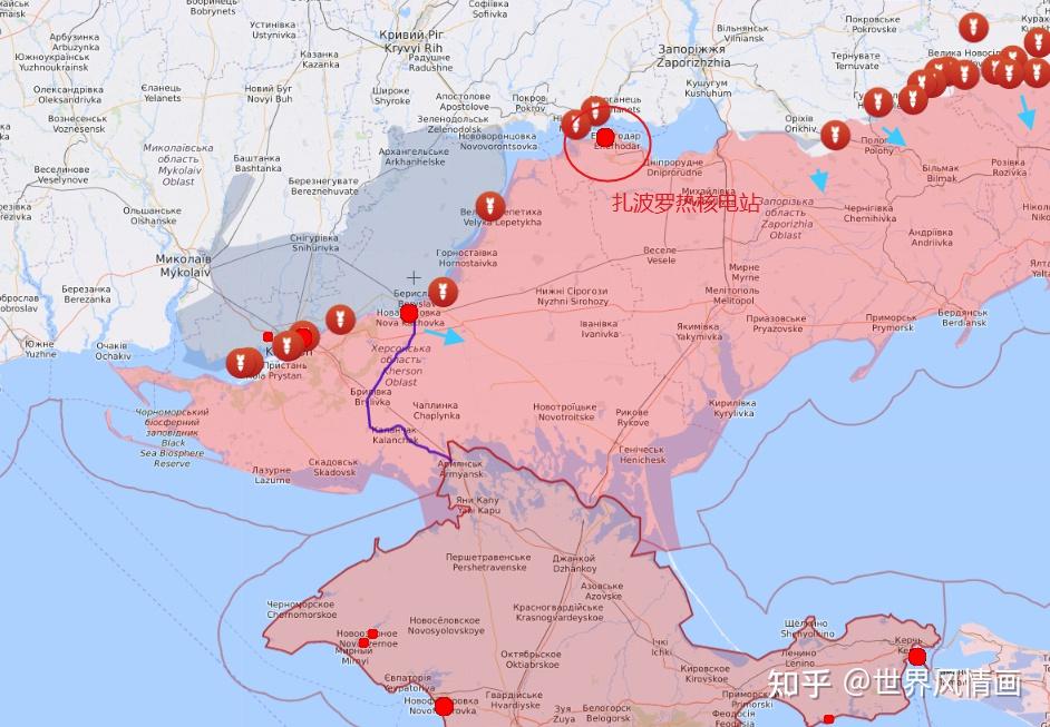 因为如上图所示,不管是乌军从赫尔松,还是从扎波罗热、顿涅斯克出发,只要方向是在向着黑海的南行,就会面临俄罗斯对扎波罗热核电站制造的“事故”,因为一但赫尔松州南部到克里米亚半岛之间的俄罗斯补给线被切断,还赖在扎波罗热其他位置的俄军就必须撤离,克里米亚半岛也会因为交通干线被切断而无法供应俄军在当地的大规模攻防战。