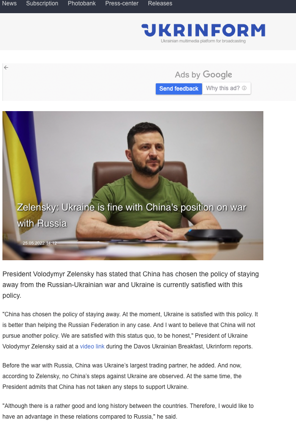 “中国选择了置身事外的政策。目前,乌克兰对这一政策感到满意。无论如何,这比帮助俄罗斯联邦要好。而且我想相信中国不会再奉行其他政策。我们对这一政策感到满意。 这种现状,老实说,”乌克兰总统弗拉基米尔泽连斯基在达沃斯乌克兰早餐期间的视频链接中说,Ukrinform 报道。