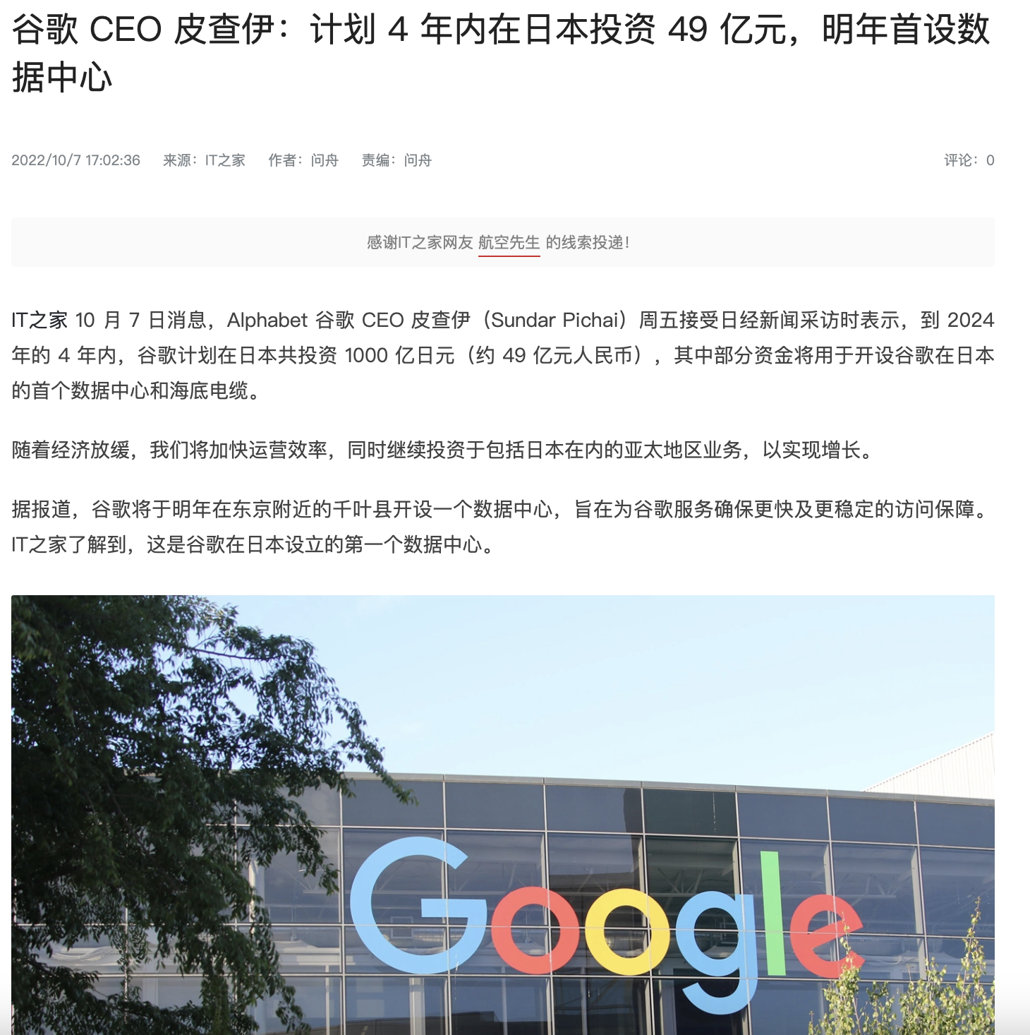 22年10月7日,谷歌CEO皮查伊访问日本,计划在日本建立首个数据中心和铺设海底电缆,总投资超过1000亿日元。