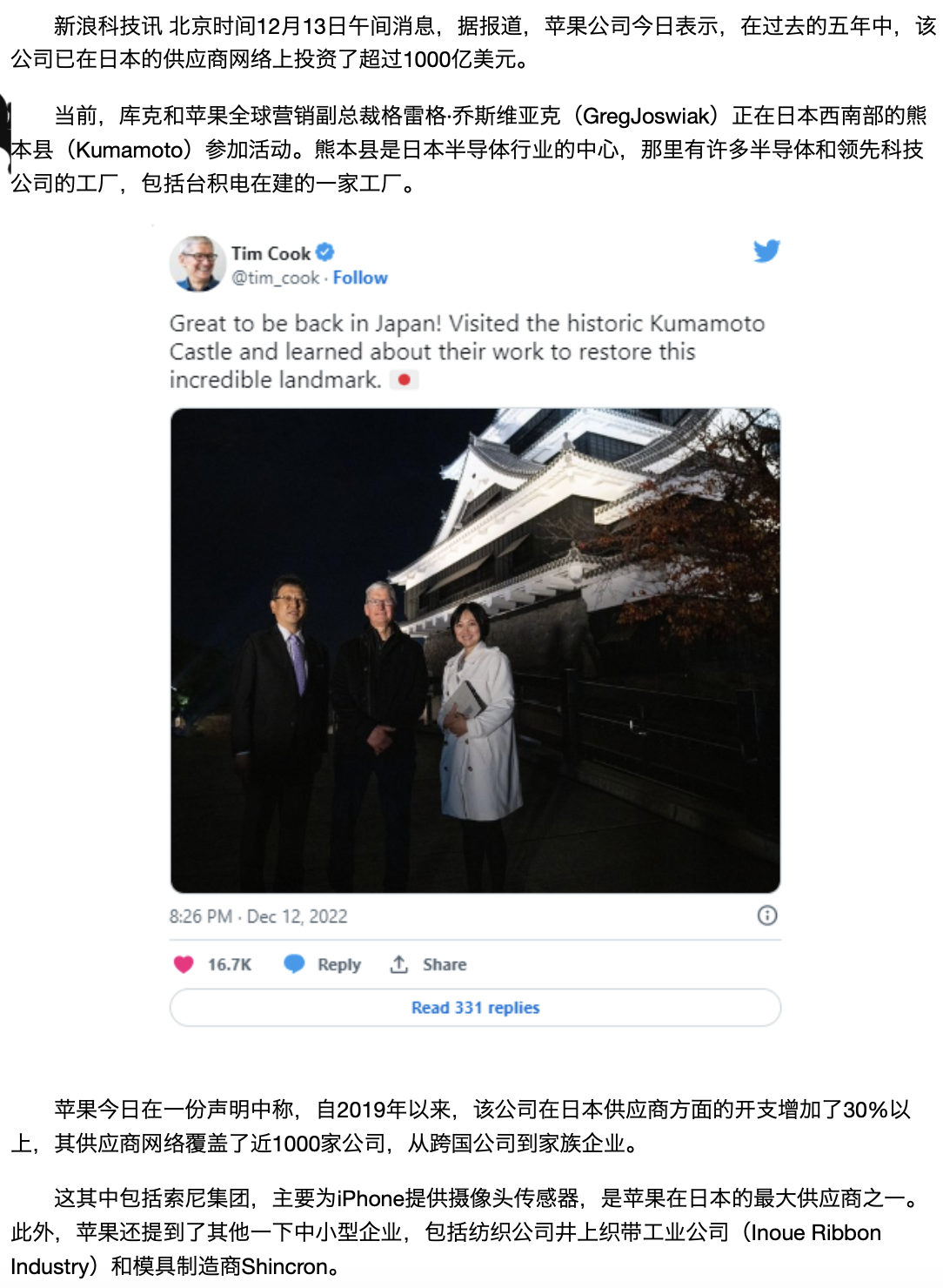 22年12月13日,苹果公司库克访问日本,透露了5年内已经在日本投资超过1000亿美元,作为苹果的供应供应商,日本公司达到了30%以上。