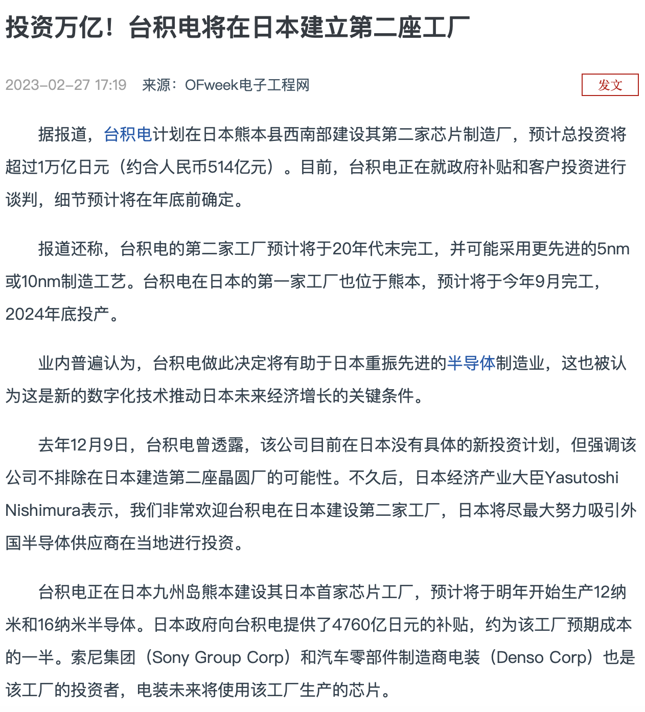 23年2月,台积电宣布在日本投资第二家芯片制造厂,总投资超过一万亿日元,将采用5纳米和10纳米的制造工艺。