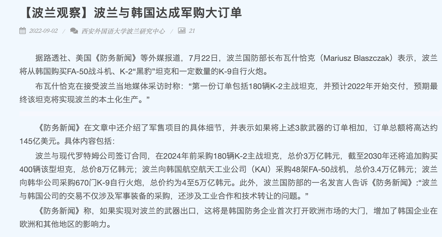 22年的1-10月,韩国的武器出口已经突破170亿美元。 最大的一单,来自于波兰。