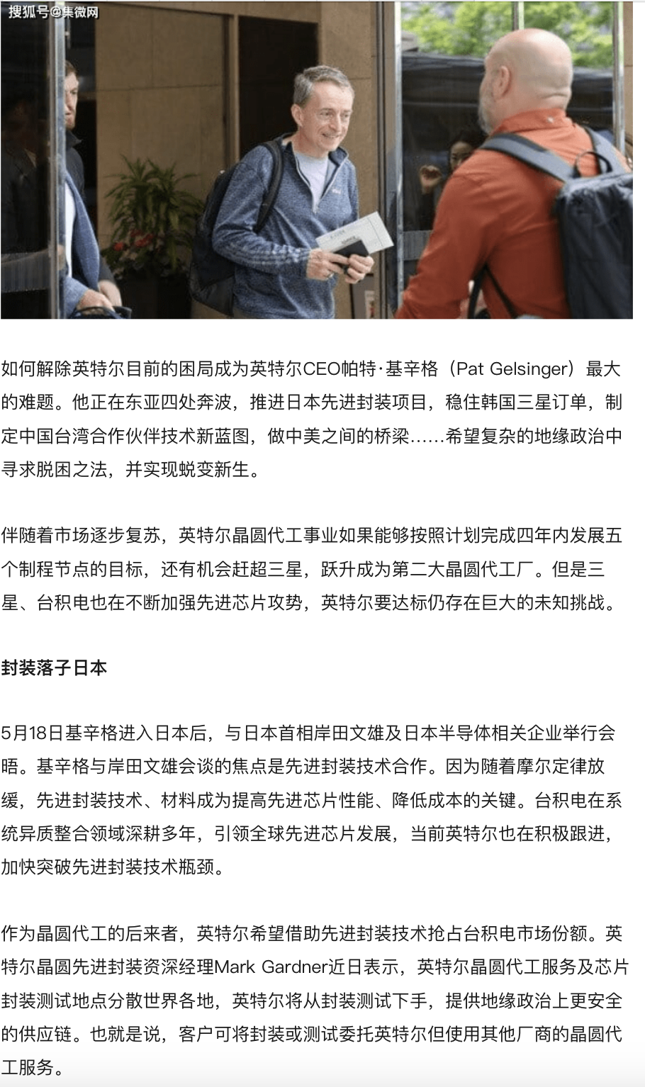 5月18日,英特尔CEO帕特·基辛格上任不久,就先访问日本,希望达成先进封装技术的合作。希望能改变晶圆半导体方面落后于三星和台积电的现状。
