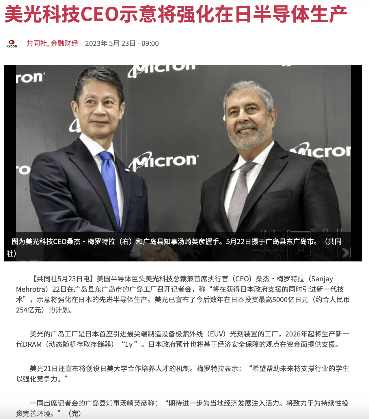 美国半导体存储器公司,美光科技,5月23日刚刚被中国制裁,就在同一天,宣布将在日本广岛投资5000亿日元,并且引入最先进的机紫外线光刻装置,2026年投产。