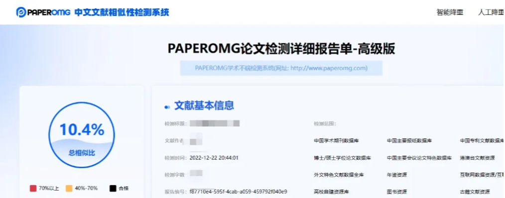 paperomg的厉害之处在于提供两种报告单:简洁版和详细版。我们可以选择简洁版来整理思路,选择详细版进行仔细修改。非常方便。此外,该网站的数据库也非常接近知网的水平。我的室友在使用该网站之前,查重率超过了30%,但经过两次查重后直接降到了10%。最后再说一下checkyear,这个查重网站也非常牛。我在查重时看到里面有大量的专业文献,并且数据库非常全面,包括博士和硕士论文库、中国学术期刊库等等。它的数据准确度很高,有时甚至比知网还要严格。在定稿之前使用这个网站进行查重可以让我们更加放心。