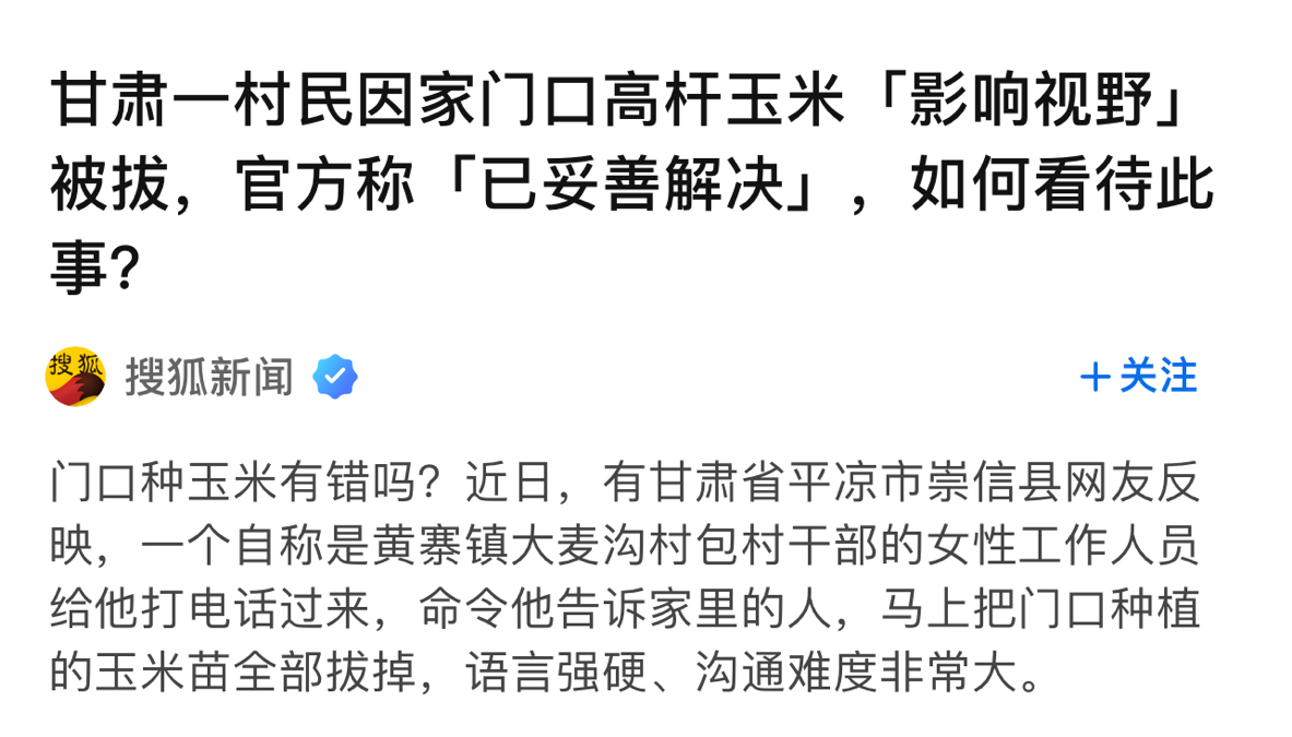 如何看待?我建议这些媒体遣词造句注意一下基本的语法。就拿这个标题来说吧,应该修改为“甘肃一村民家门口高杆玉米因影响视野被拔”。现在这个标题,搞得我虎躯一震,还以为村民脑袋被谁给拔掉了。编辑于 2023-06-29 15:12・IP 属地江苏赞同 241 条评论分享收藏喜欢收起
