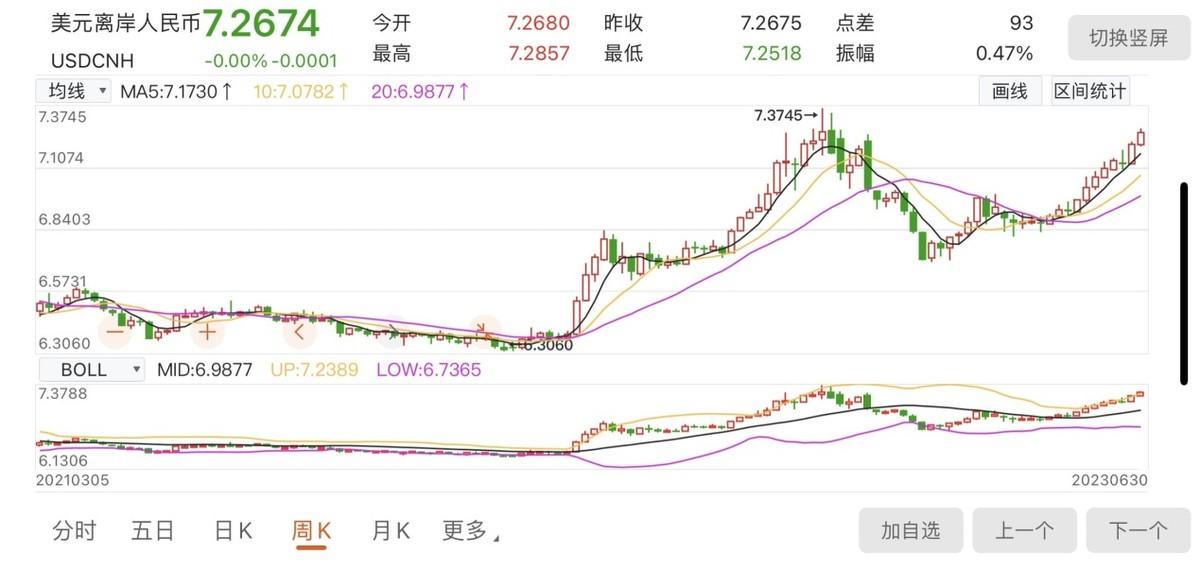 此轮人民币贬值主要有两个原因:1、美元处于加息周期而人民币一直降息。2、经济下行。不过美元已进入加息尾声,人民币再降息的空间也不大。不过,从技术面来看,人民币汇率预计还要冲击去年底7.37高点形成M顶后才会开启升值过程。这个时间点应该是在7月美联储议息会议前后。