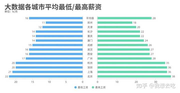 薪资那一列都有一个最低薪资和最高薪资,我们通过不同城市来对比分析一下,发现北京的工资水平最高,最低为22k,最高为38k。