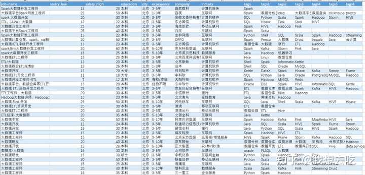 那么这些岗位都需要什么技能呢?Spark,Hadoop,数据仓库,Python,SQL,Mapreduce,Hbase等等