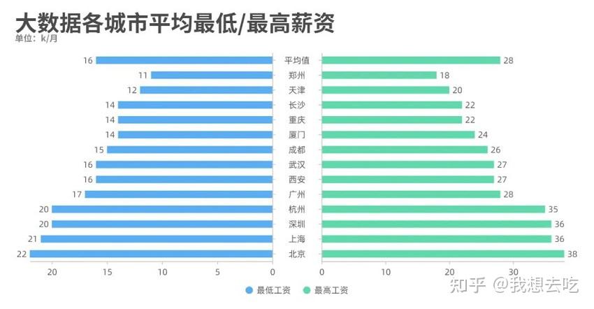 薪资那一列都有一个最低薪资和最高薪资,我们通过不同城市来对比分析一下,发现北京的工资水平最高,最低为22k,最高为38k。