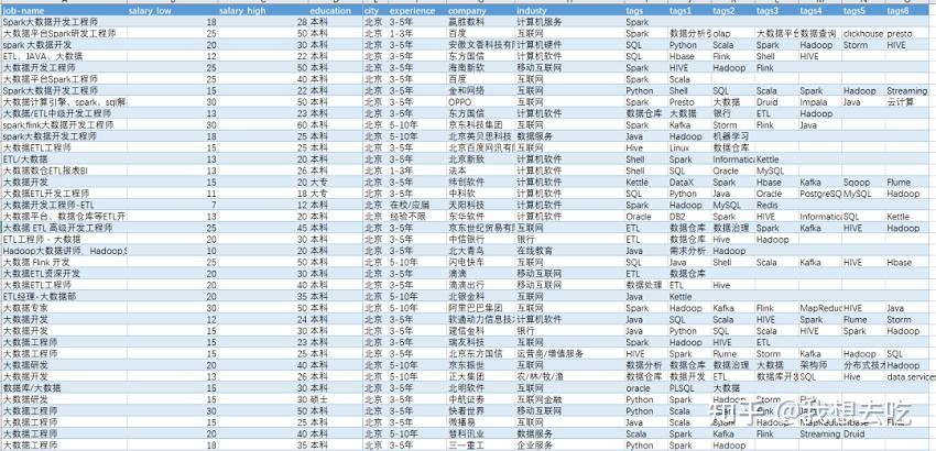 那么这些岗位都需要什么技能呢?Spark,Hadoop,数据仓库,Python,SQL,Mapreduce,Hbase等等