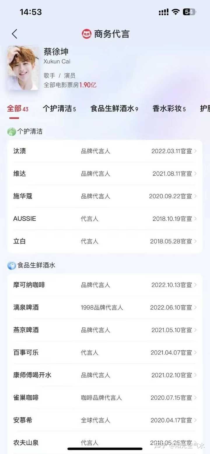 根据猫眼专业版影人查询的信息,目前蔡徐坤身上的代言总计达到了43个。
