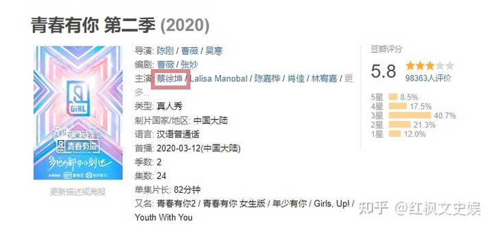 还有消息指蔡徐坤被“青春有你”豆瓣词条除名,笔者查询发现,目前该词条同样正常显示,蔡徐坤的名字和照片依旧在列。