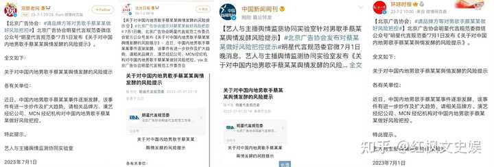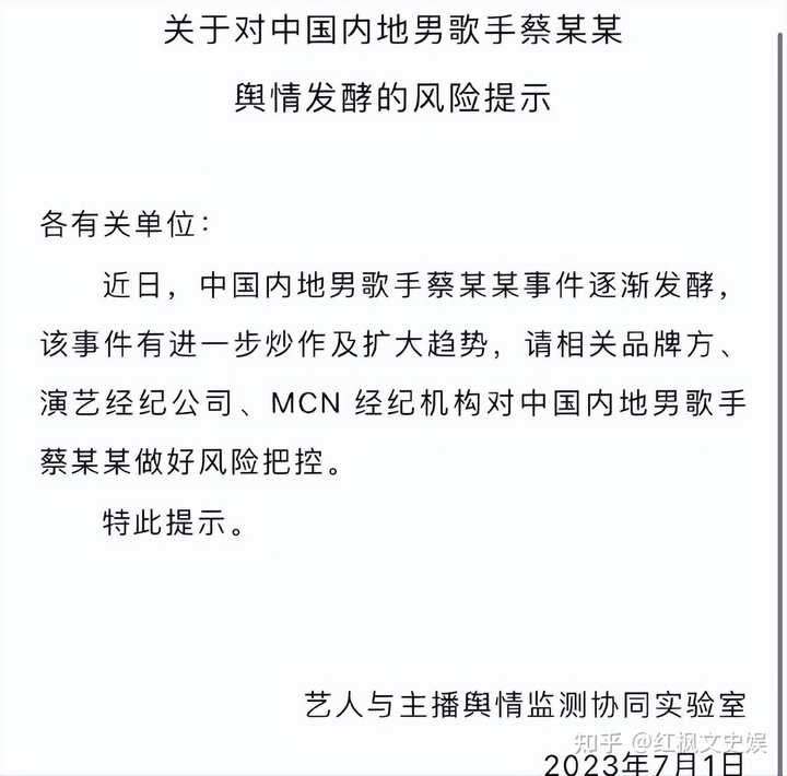 “近日,中国内地男歌手蔡某某事件逐渐发酵,该事件有进一步炒作及扩大趋势,请相关品牌方、演艺经纪公司、MCN经纪机构对中国内地男歌手蔡某某做好风险把控。”