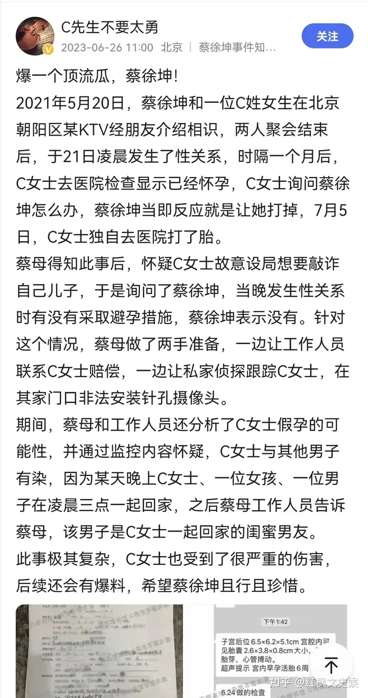 此前,6月26日,有博主爆出“2021年蔡徐坤和C姓女生发生男女关系,导致对方怀孕并逼迫其流产”,引发关注。