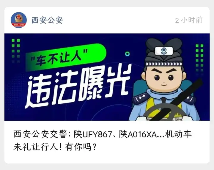 搞笑的是,就在两小时前,我的微信收到西安公安公众号的消息:未礼让行人汽车曝光。