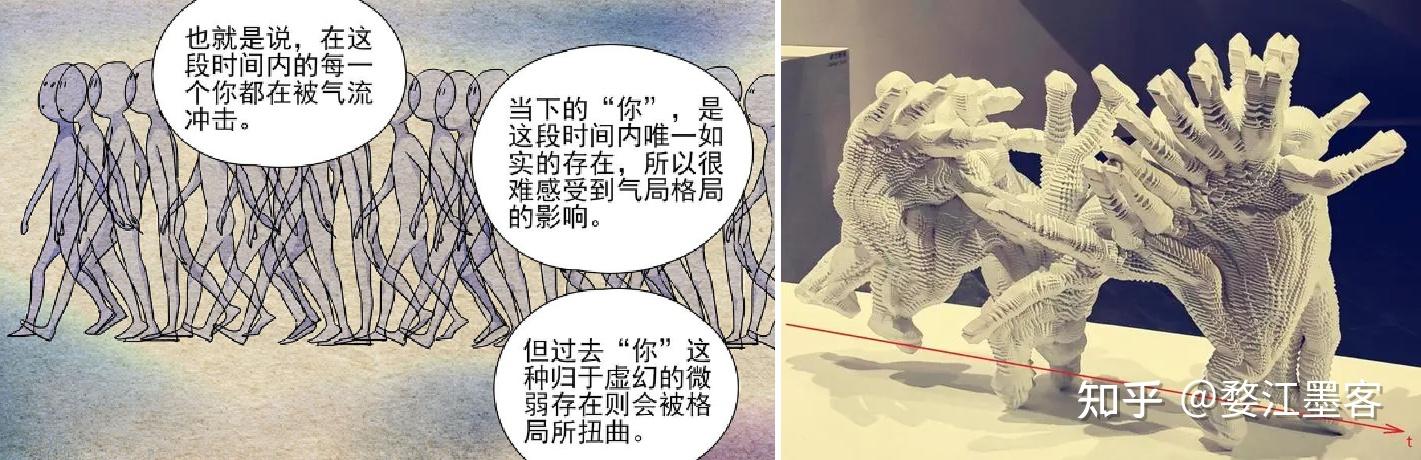 在三维生物的眼中,过去的自己消失在前一秒,未来的自己即将诞生在后一秒,一个人由生到死,在观察者眼中只有一个独立的个体,当下所能感受的是现在。如果把时间划分成段的话,那么在每个时间段人类只能看到它的一部分,而不是全部。