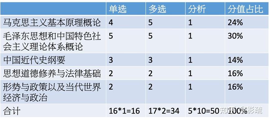 考研政治包括五大学科,其中马原大约占24分;毛概最多,占30分;近代史纲要占14分;思修占16分;形势与政策占16分。各部分题型比例和分值如图所示: