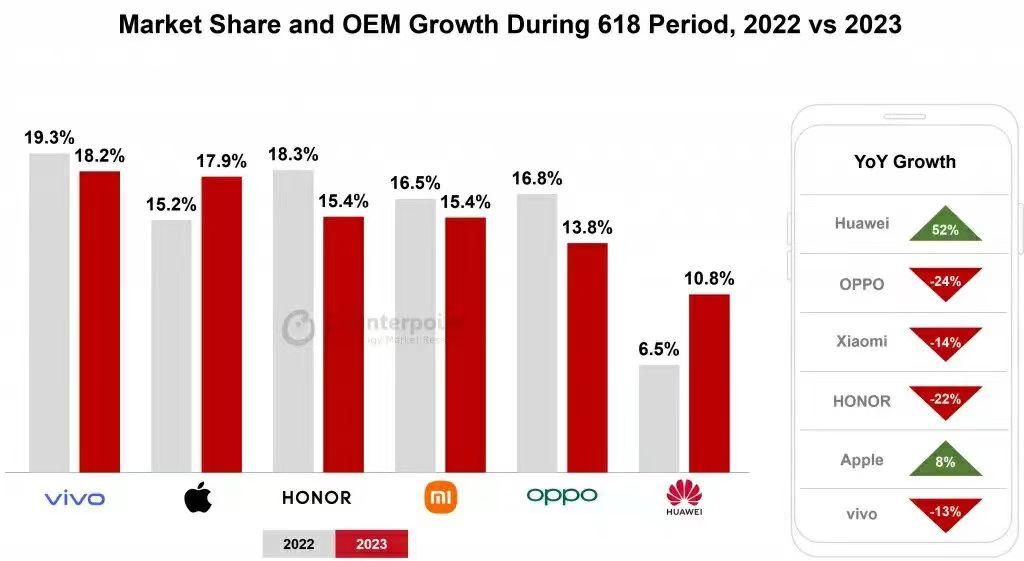 荣耀奋起直追,以15.4%的市场份额与小米打成平手。
