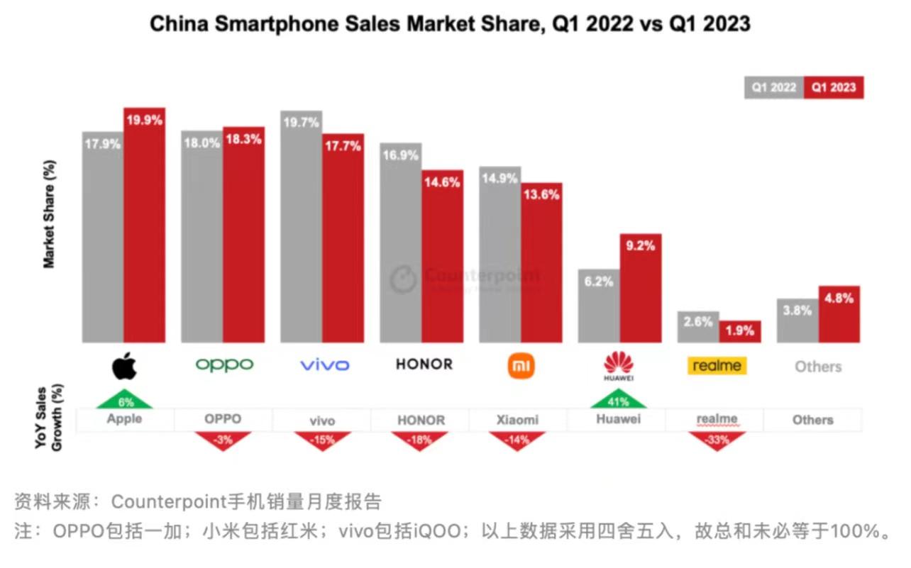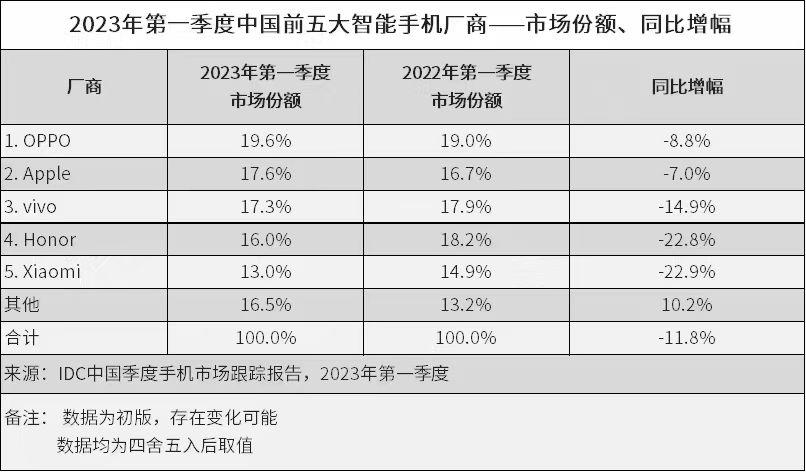 让人惊讶的反而是荣耀,荣耀2023年第一季度年增长率与去年同比下滑35%,出货量排在了国产手机品牌第三。