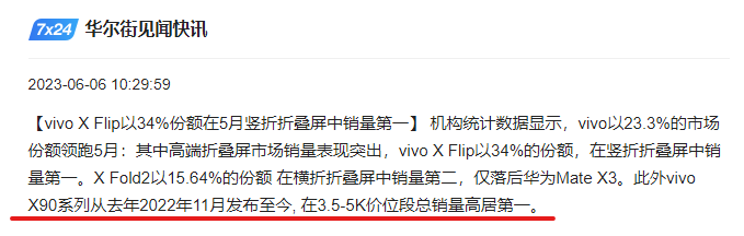 甚至就连5000+的超高端市场,蓝厂也凭借竖折叠的vivo X Flip取得了巨大成功,发布后不久就登顶竖折叠销量第一。