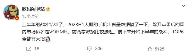 2023年上半年,除开苹果后的国内市场排名依次是vivo、OPPO、荣耀、小米、华为。