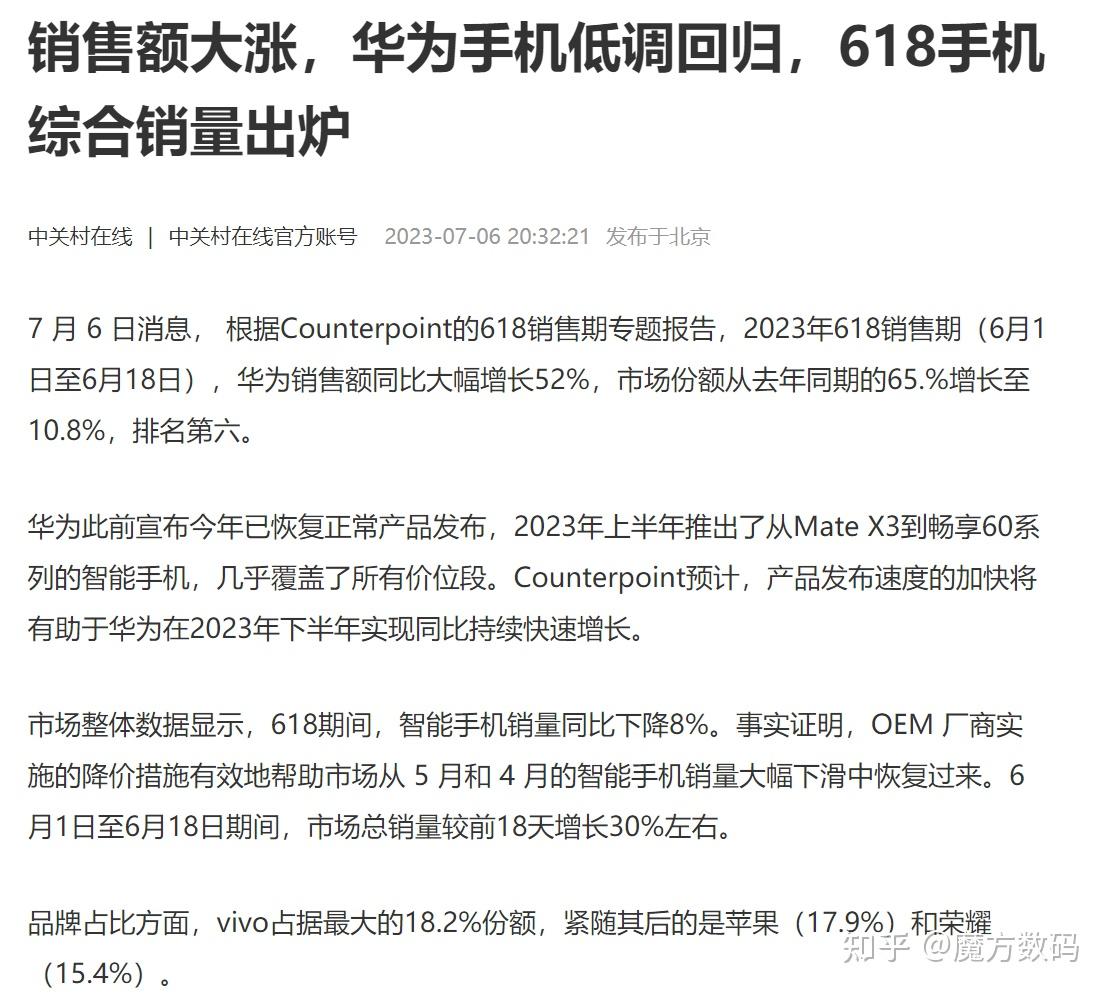 华为手机虽然没有进入到中国市场销量前三名里面,但是在2023年第1个季度销量足足上涨了超过40%,足见华为也在不断努力加速回归。
