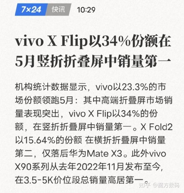 近期相关权威机构统计数据显示,vivo在5月以23.3%的市场份额领跑整个手机市场,展现出强大的销售实力,其中,高端折叠屏市场的销量表现尤为突出,vivo X Flip以34%的份额在竖折折叠屏中销量位居第一,这一成绩还是相当不错的。