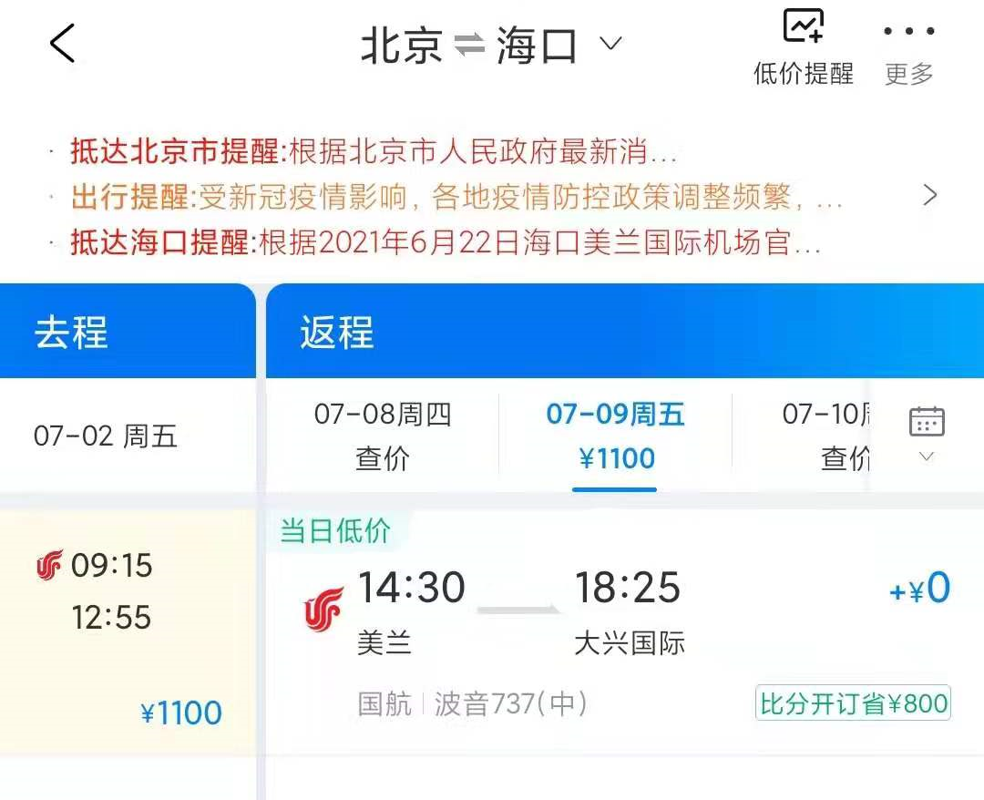比如大家可以多关注一下OTA的特价机票区域,或者善用日历搜索,可以看到相应低价的出现。比如我就看到在携程上看到7月初的国航往返北京海口,居然可以做到1200元含税的的直飞票价。