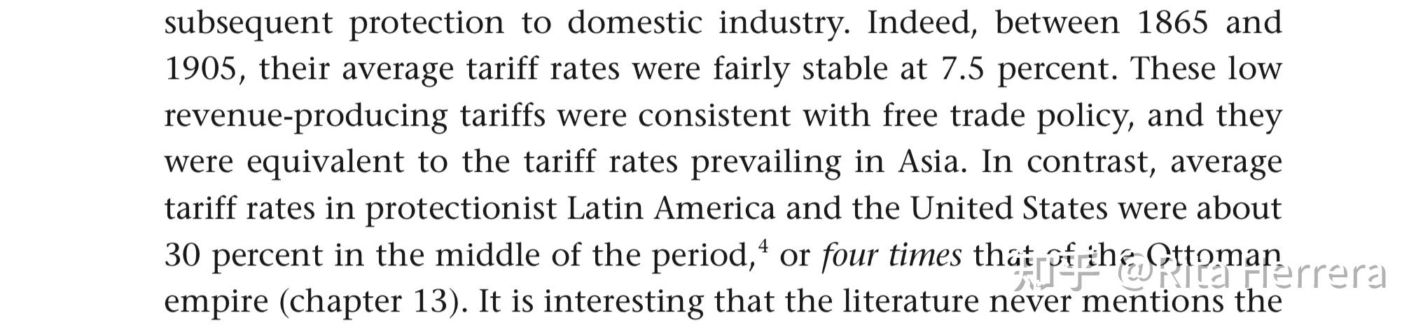 比如1838年的《英土通商条约》中规定英方在奥斯曼采购原材料不需要支付关税,货物进口关税3%,出口关税则为12%。奥斯曼此后又与其他列强签订条约,平均关税7.5%。低关税符合自由贸易的原则,与亚洲国家平均税率相当。相比之下,实行贸易保护主义的拉丁美洲和美国在这一时期的平均关税率约为 30%,是奥斯曼的四倍。