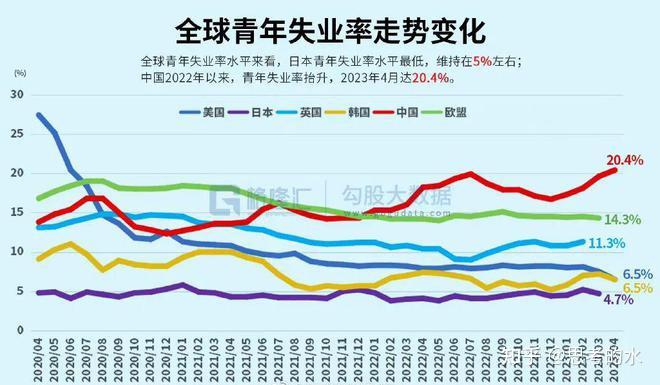 总体来说这今年中国的青年失业率是上升的多,下降的少,总体趋势是上升,欧美和美国整体趋势是下降,目前指标已经遥遥领先世界欧美、日本和韩国,当然赶美国曾经的高点还差一点距离,按照目前这种趋势我估计接下来2年会赶上曾经美国的高点。