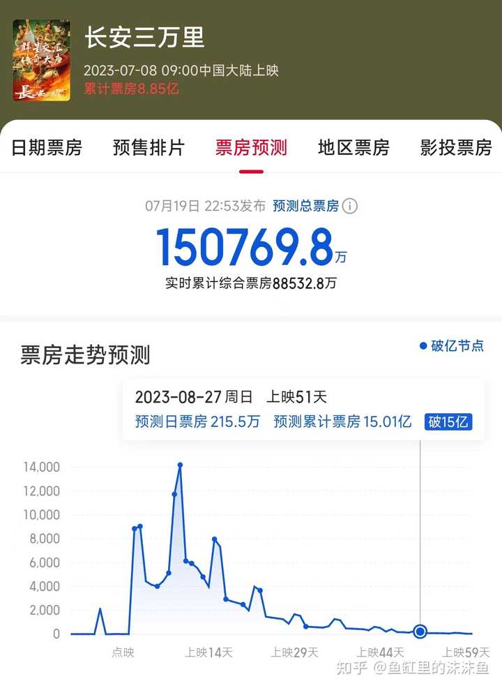 先说意料之外,追光本就是国内数一数二的动画制作公司,无论出品数量还是质量都占据了国内动画电影市场的一席之地,之前主营的两个系列也得取得了10亿+的票房(白蛇、新神榜),然而跟同期光线的哪吒和姜子牙累计五六十亿的票房相比,也着实惨淡了些,至于单片10亿的动画,目前国漫里只有上述两部和熊出没做到过,而长安三万里这次冲关10亿已是板上钉钉,截至7月17日猫眼对最终票房的最新预测是15.35亿,对比首映日时的预测5.1亿,刚好翻了三倍。