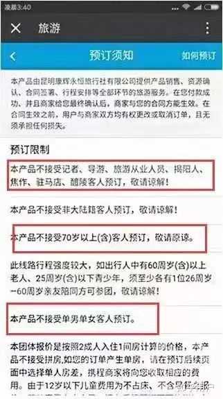 2017年,某平台上就有一些"特价旅游团",限制了参团消费者的地域、年龄、性别,甚至直接写出了禁止记者、律师和旅游从业人员参加。后经举报,平台方才将违规产品下架,产品供应商也受到了相应的处罚……