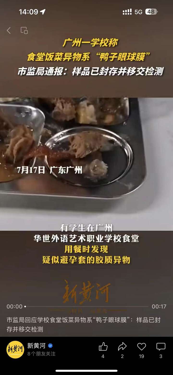 广州一职校食堂吃出胶制异物,学校称异物是鸭子眼球膜,市监局「已责令涉事食堂关闭」,如何看待此事?