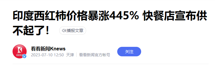 一开始呢,媒体报道的是印度西红柿涨价300%: