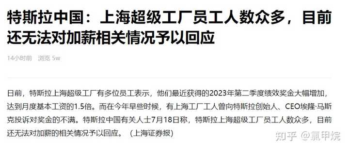 最近两三天又有媒体报道,特斯拉上海超级工厂的员工最近收到的2023年第二季度绩效奖金增加了很多,达到了月度基本工资的1.5倍。此前员工曾向CEO马斯克投诉奖金问题,而如今他们却表示奖金有所提高。在没有收到薪资之前,员工是完全不知道有涨奖金的事情,是收到工资条以后才发现自己的钱多了不少。看到这这个新闻,我只想说或,我真的太羡慕了。