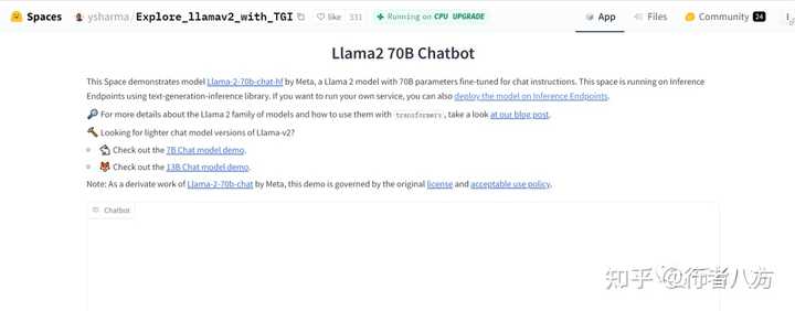 Perplexity Al Chat 软件嵌入 Vercel Al SDK Playground 平台接入 a16z Playground 公司接入 lmsys Chatbot Arena 平台接入 HuggingFace Space by ysharma 平台接入 Your Own Local LLaMa 2 via @LangChainAl 平台接入 Deploy Your Own LLaMa 2 Inference Endpoints 平台接入 Build from HuggingFace Transformers 平台接入 微软接入 巨头平台支持 AWS接入 巨头平台支持 Pietro Schirano 个人接入 1. Perplexity AI Chat https://perplexity.ai/