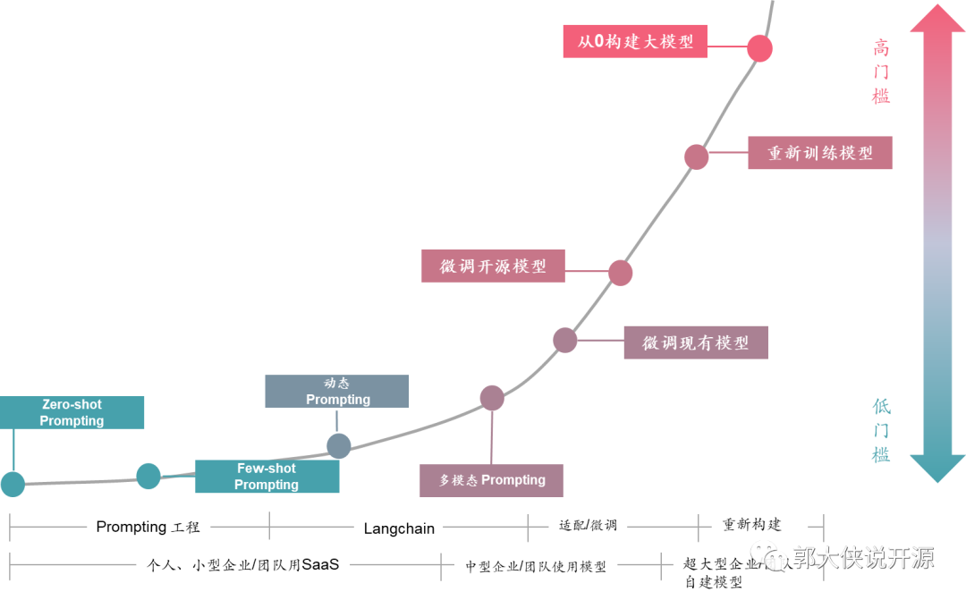 而现在各种开源社区都在进一步降低这个门槛,将大模型变得“人人可用”,例如Apache DolphinScheduler社区发布的文章《用一杯星巴克的钱,训练自己私有化的ChatGPT》,就给出了让普通程序员甚至数据分析师快速用自己的数据优化大模型的方案。而Apache SeaTunnel也在准备做企业内部数据和大模型的打通之间的Langchain《图书搜索领域重大突破!用 Apache SeaTunnel、Milvus 和 OpenAI 提高书名相似度搜索精准度和效率》。这些都会让没有相关人员、处理复杂数据、不知道怎么调优的企业进一步拥有自己的大模型。我相信,未来大模型的门槛曲线是下图虚线这样的,未来每个会使用ChatGPT的企业和个人,都可以拥有自己私有化的大模型: