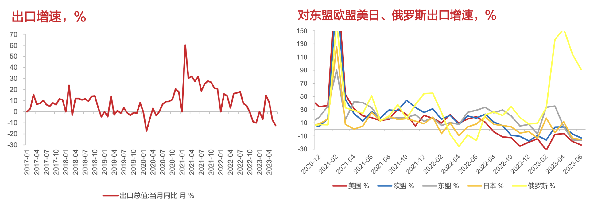 6月出口增速-12.4%,5月-7.5%,4月8.5%,仅4月保持了正数。新能源汽车出口较好,但其他产品支撑力不足。对外出口的国家中,对东盟欧盟美日出口均出现较大幅度下降,仅俄罗斯出现爆发增长,但总体规模不大。