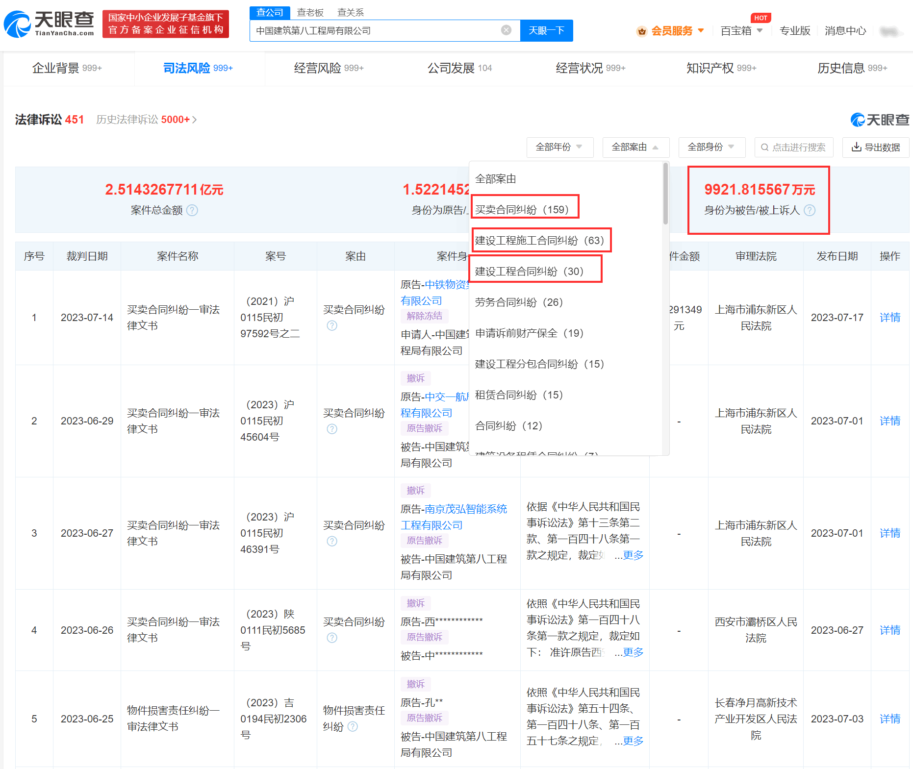 2023年7月11日,中建八局还成为了被执行人,原因是与其他公司存在买卖合同与建设工程施工合同的纠纷。