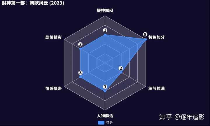 按照剧情部分来看,全剧内容基本完成闭环,但仅能说就剧本身自圆其说,稍微注入一些外部逻辑就会塌方,好似古墓里的文物见不得空气一般。一般据此该仅能得60%的分数,但考虑到“把故事讲完整”已经是封神题材里的稀缺品,因此再提升10%权重,则剧情本身为:4*70%=2.8分。