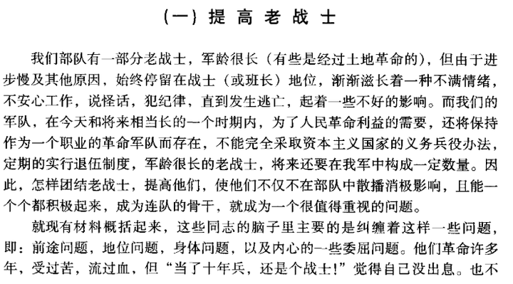 《改善对几种战士的领导方法》1945年5月 载于《中国人民解放军政治工作资料选编》第7册 甚至于说,经历过二万五千里长征的老红军,也是有这样的:在革命军队里待了那么久,因为种种原因,只能做个“老兵”,不能当干部,感到生活委屈,觉得“自己没出息”。讲坏话、反纪律有,当逃兵、想自杀,同样会有。