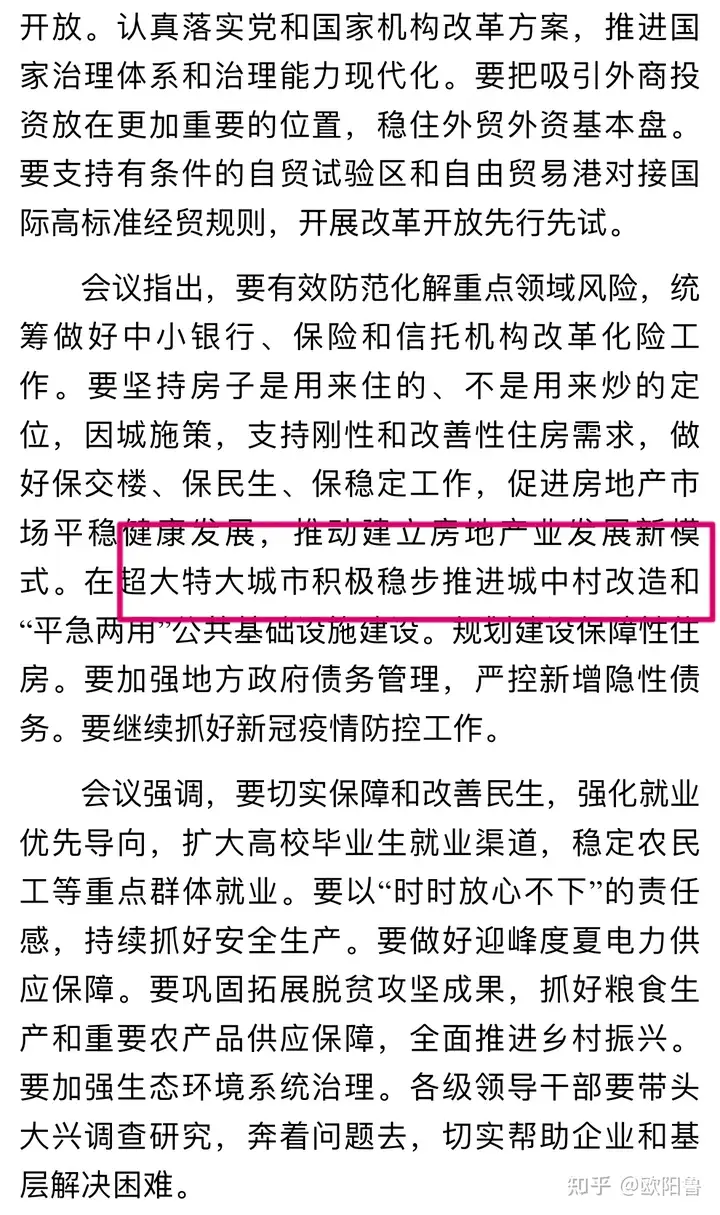 “会议指出,在超大特大城市积极稳步实施城中村改造是改善民生、扩大内需、推动城市高质量发展的一项重要举措。”
