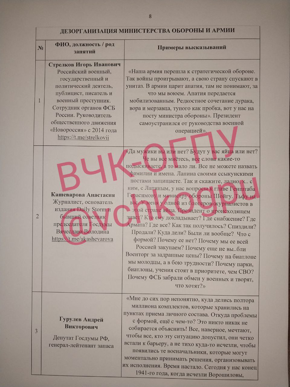 除了吉尔金之外,退役陆军军官弗拉基米尔·克瓦奇科夫 (Vladimir Kvachkov) [7]和列昂尼德·伊瓦绍夫 (Leonid Ivashov) [8]— — 他们一直直言不讳地批评战争 — — 以及“类似的带肩章的退休人员”也成为攻击目标。报告呼吁“因怀疑而给他们带来严重麻烦,例如软禁几个月: