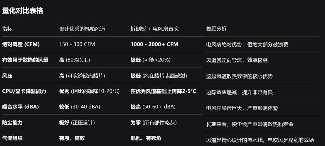 但从风道机箱到拆侧板用电扇吹,只能再获得2-5°C的微弱降温,收效甚微。