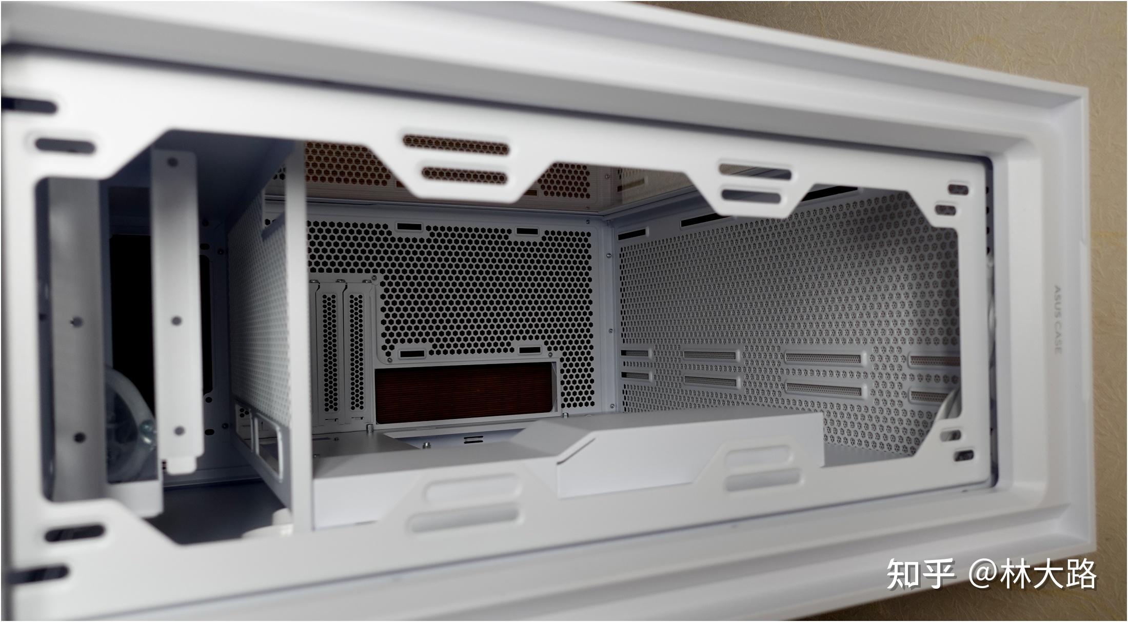 可以看到门是合页的,也就可以像门一样打开,这个机箱服役过3070显卡,我觉得差不多算最高上限了,如果更高根本也是压不住的,哪怕这时候有底部、顶部散热设计了。而到了新时代,实际就直接不装了: